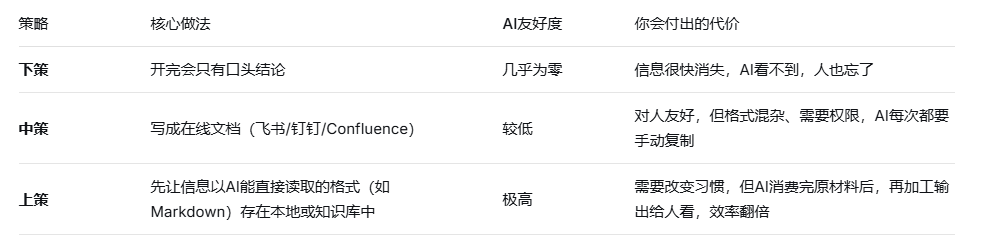 中策路径:你花半小时写了一份会议纪要发在群里。信息存在了,但对AI不友好。