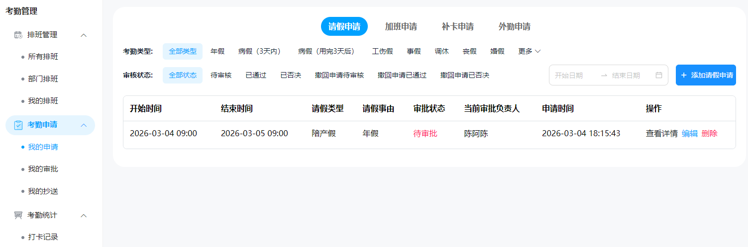 4、请假、加班、补卡等申请流程可视化,支持多级审批、权重设置、抄送人自定义,审批进度实时可查。