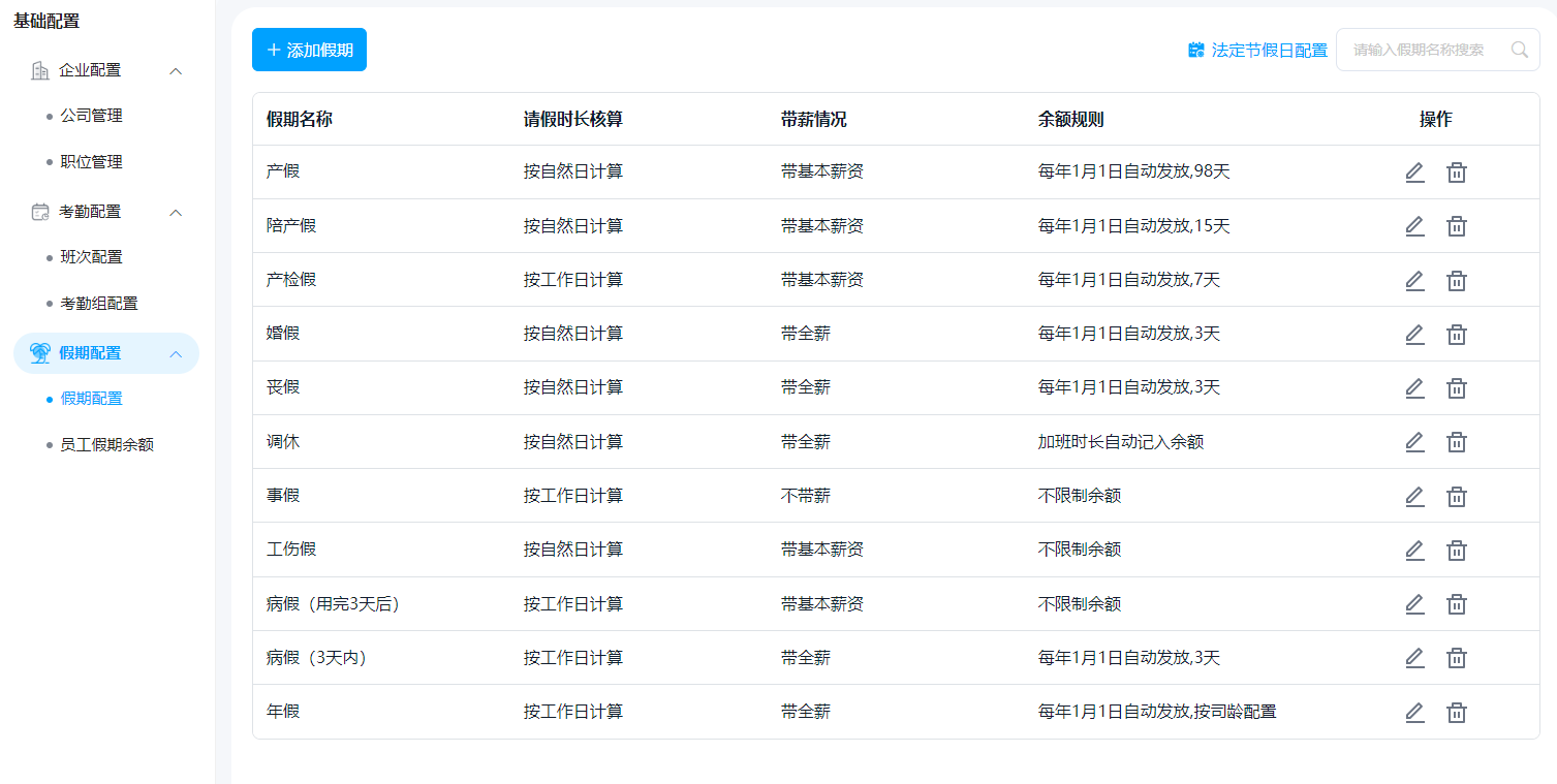 5、支持产假、婚假、年假等多种假期类型自定义配置(带薪规则、按司龄递增等),假期余额自动计算,员工可随时查询,减轻HR负担。
