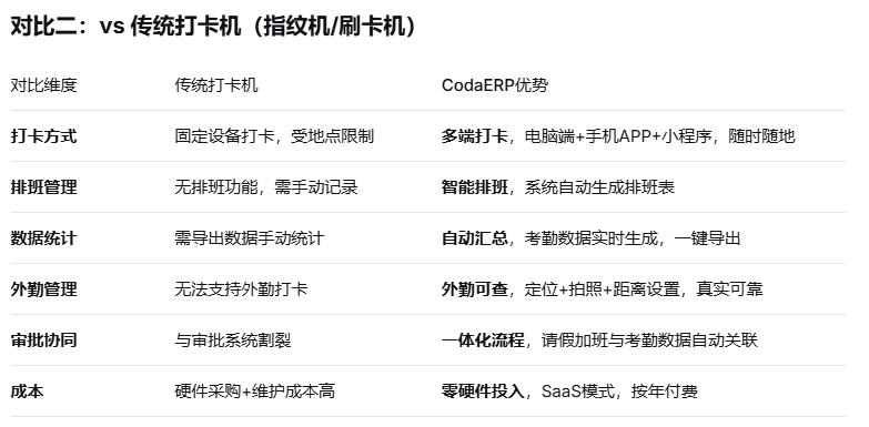 2、vs 传统打卡机:无需硬件投入,支持多端随时随地打卡,具备智能排班、自动统计、外勤管理、审批协同等全面数字化能力,更智能、灵活且省钱。