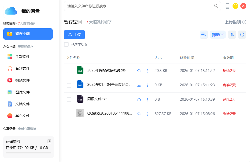 Codayun网盘强调的是临时空间,因为大部分中转文件都是临时文件,生命周期都是几个小时、几天,所以7天一过,文件不需要你清理,就自动消失。但是如果你想长期留档,也可以右键一键转入永久空间。