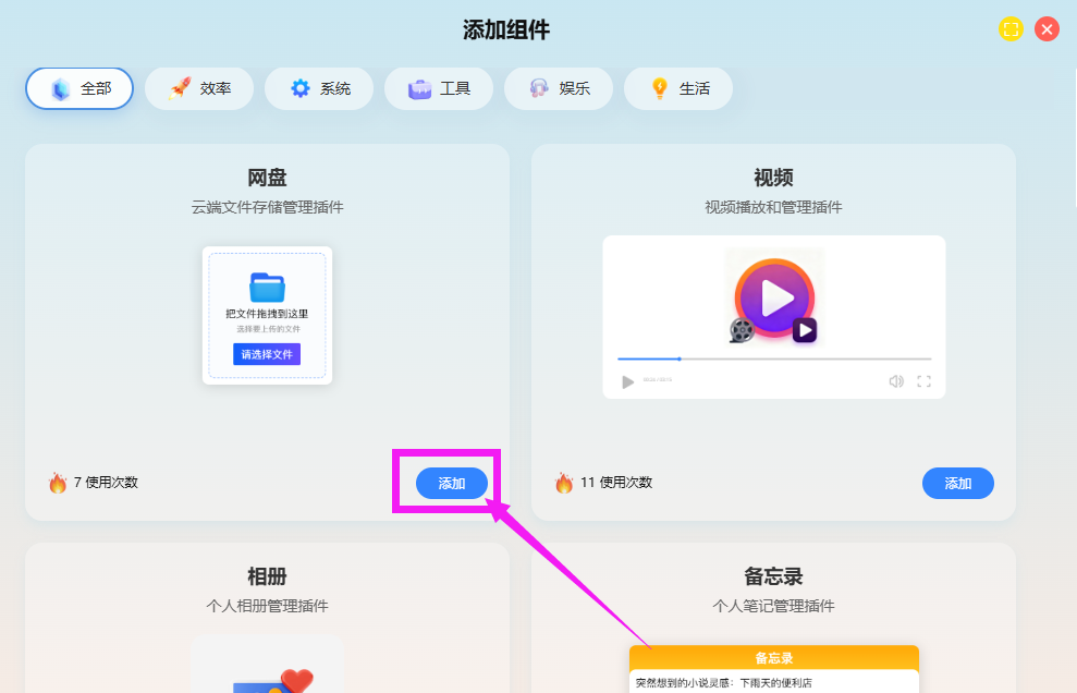 点击应用台下方的【组件台】图标,挑选你需要的组件,点击添加按钮,即可置入科达云桌面