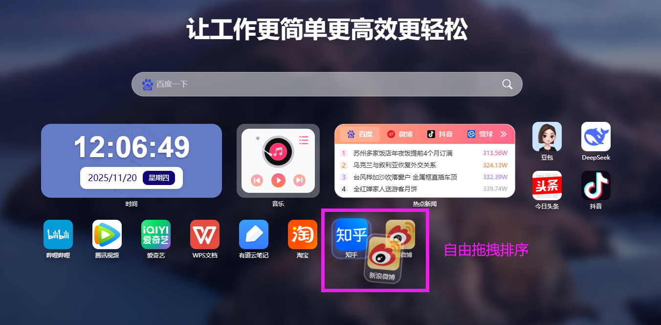 回到科达云桌面,我们可以自由拖动桌面的组件、网址,来调整它们的顺序,如果不需要的也可以右键把它们移除;底部的应用工具也是同样的操作。