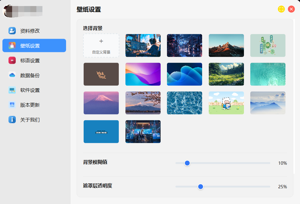 (1)点击应用台下方的【设置】图标,找到壁纸设置,你可以在这里自由更换、上传自己喜欢的背景图,还可以对它们设置模煳值和透明度。