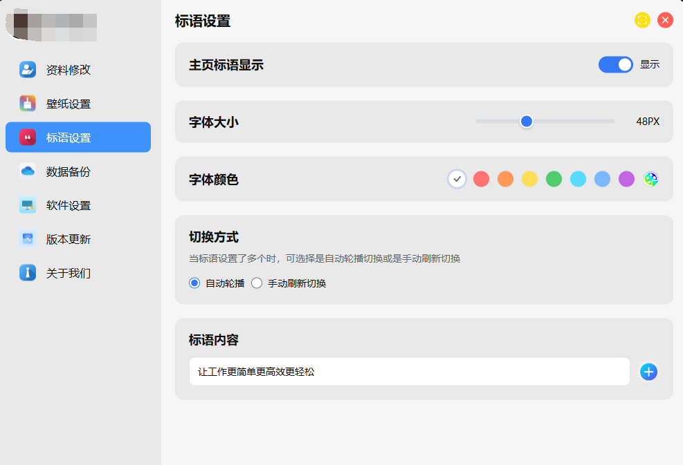 (2)切换标语设置,设置你的桌面标语显示,可以把你的座右铭、名言语录添加到你的主页签名上。