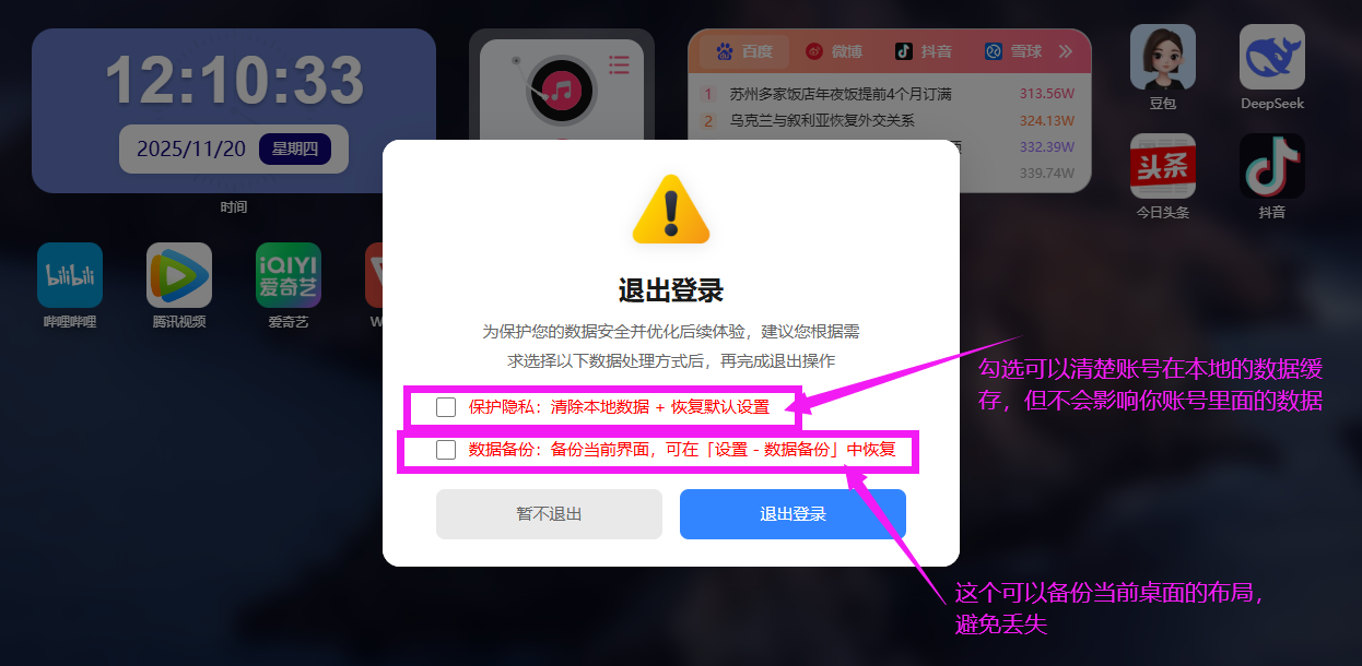因此我们在陌生的电脑上登录时,【退出登录】时别忘了勾选【清楚本地数据】,这样就可以把你留在当前电脑的缓存彻底删除,但是不会影响你账号里面的数据。