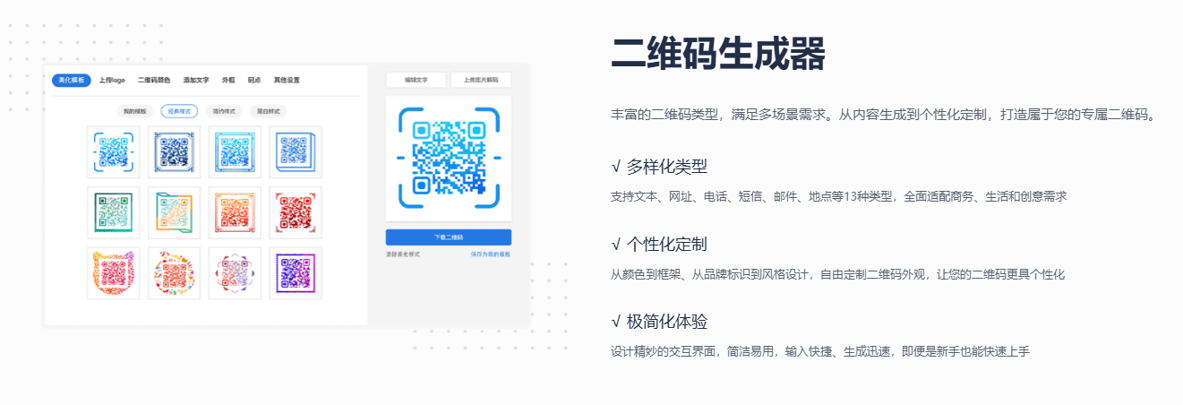 想让二维码脱颖而出?它强大的个性化定制功能就是你的秘密武器。从二维码的颜色、框架,到添加品牌 logo、设计独特风格,统统可以自由发挥。黑白简约风、绚丽多彩风、经典复古风…… 根据不同使用场景和品牌调性,定制独一无二的二维码,让它不仅是一个识别码,更是一张亮眼的创意名片,轻松吸引用户扫码。