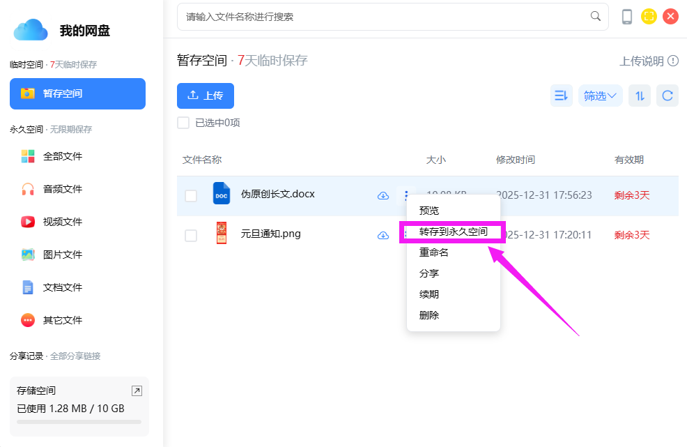 不过如果你也需要永久备份,那么你可以右键将其转存到永久空间。