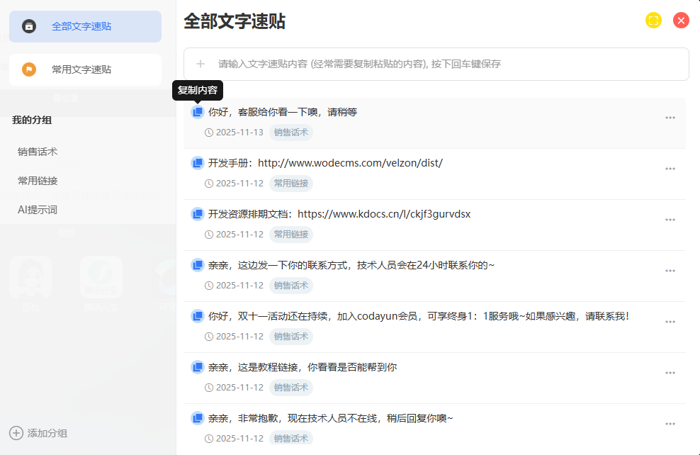 一款优秀的工具,绝对不仅仅只有流畅的切换动作、个性化的桌面定制和各种网址导航,那些功能齐全的小组件,同样也是必不可少的。 大多数网盘都在强调“永久存储”、“超大空间”,但我们日常工作生活中,其实大量文件只需要临时过渡。比如一份完成70%的方案、待处理的图片、需要润色的文稿等等,这些文件的生命周期可能只有几小时到几天。 这款酷似ios备忘录的工具也是职场人效率必备,它除了普通的分组、记笔记功能,还有那些惊喜点呢? 如果你在工作中也是需要经常处理重复和高频文案的,那你一定不要错过这款粘贴板工具。不管是反复用到的文案、模板,还是回复用户的话术,你只需要输入回车,就添加成功了。然后点击左边的按钮就可以轻松复制。你还可以创建不同的分组,以便更好地管理你的文稿模板。
