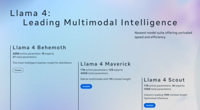 周六,Meta公司在其加州总部正式发布了第四代Llama大语言模型系列,这标志着其人工智能研发进入全新阶段。此次发布的Llama 4系列包含三大主力型号,每款都针对不同应用场景进行了深度优化: