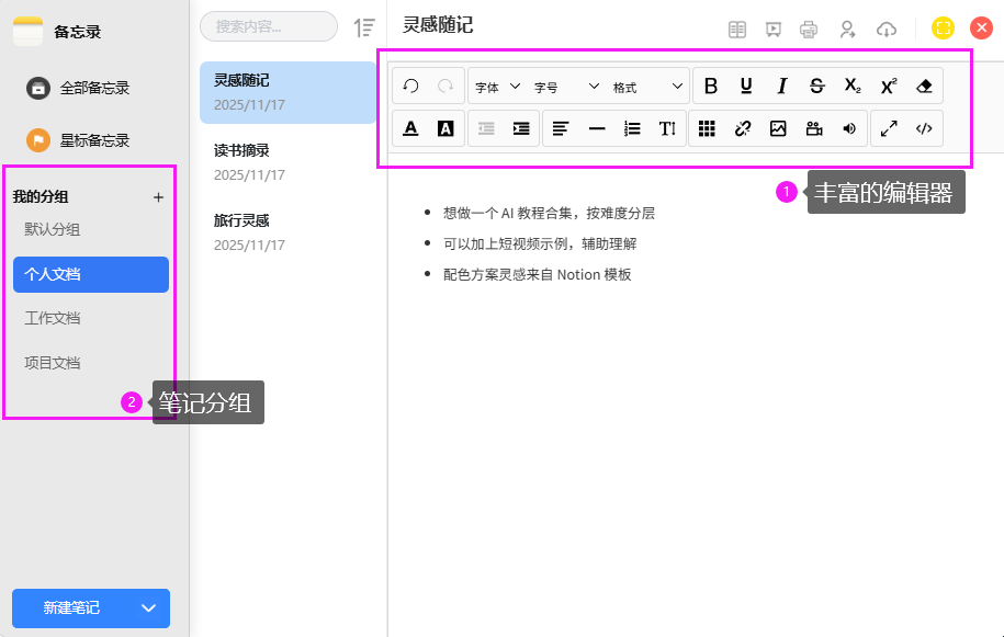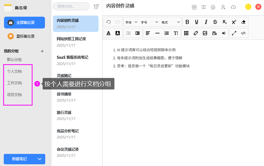 3、井井有条的分组管理: 虽然它轻量,但并不简陋。你可以支持分组做笔记,把生活琐事、工作项目、学习资料分门别类。看似随手一记,实则井井有条。
