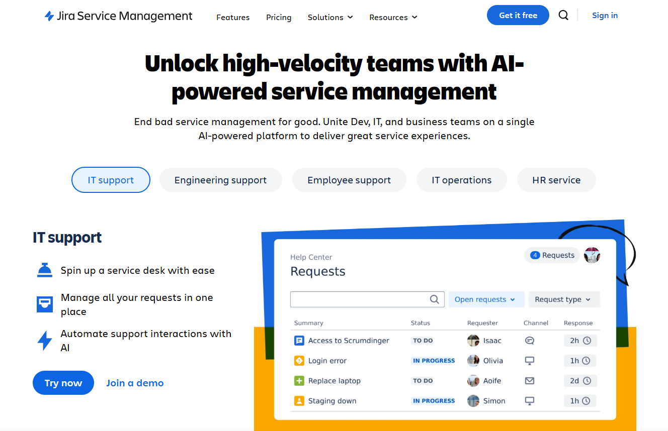 Jira Service Management 支持通过邮件、门户网站、电话及聊天机器人收集工单,自动分类和分配任务。它内置强大的自动化功能,能根据规则触发通知、优先级调整及流程审批。集成知识库帮助减少重复工单。支持SLA管理、变更管理及事件管理,确保IT和客服团队高效响应。通过详细报表和仪表盘,管理层能实时监控团队绩效和用户满意度。