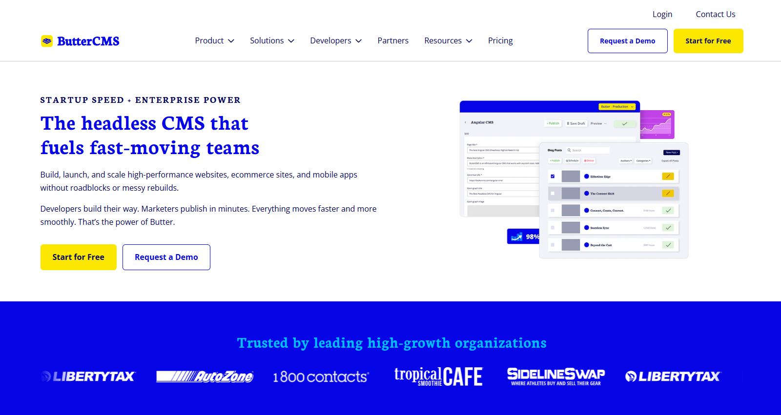 ButterCMS 是一款基于 API 的无头内容管理系统(Headless CMS),让开发者可以在不改变前端框架的情况下灵活管理内容,支持集成到任何语言与框架中,如 Next.js、Laravel、React、Vue 等。
