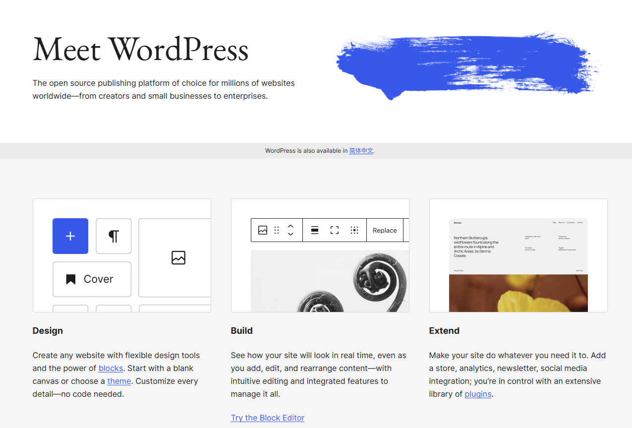 WordPress 支持文章、页面、分类、标签的管理,拥有庞大的主题和插件生态,方便快速打造企业官网、博客、电子商务平台和内容门户。内置强大的编辑器(Gutenberg),支持SEO优化,支持多语言、多用户协作。借助插件还可实现会员管理、电子商务(WooCommerce)、表单制作、缓存优化等功能。适合没有开发经验的运营人员快速上手,也支持开发者二次定制。