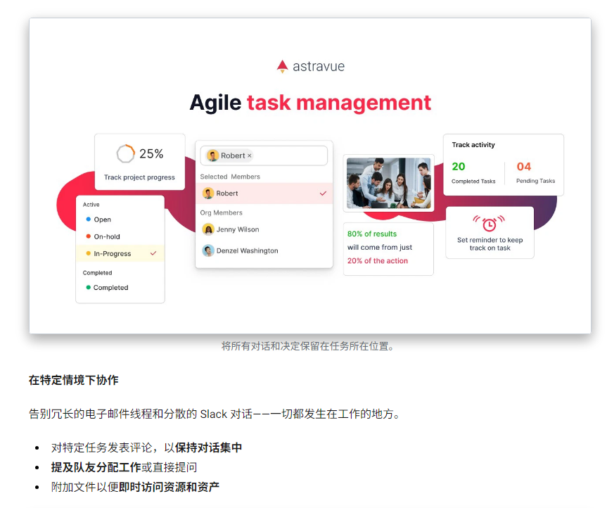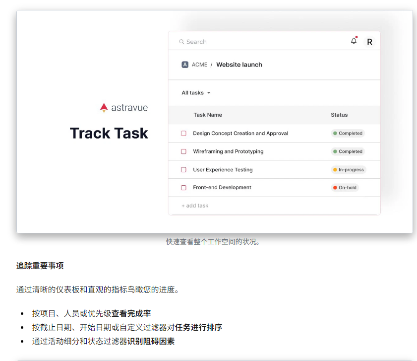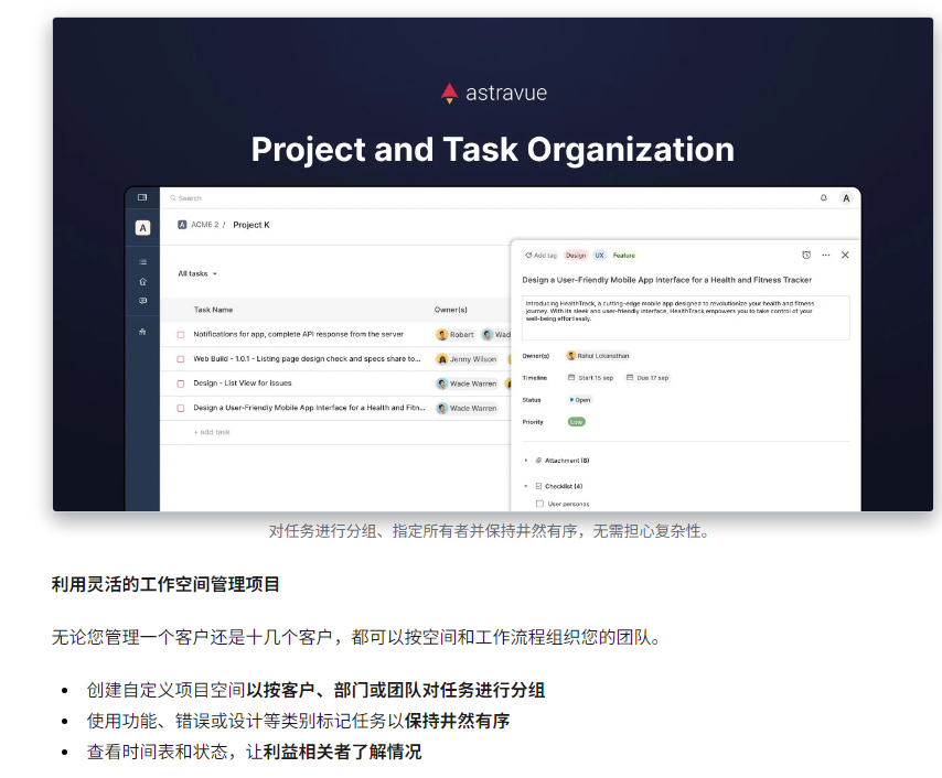 用户还可以为不同客户或部门创建独立的项目空间,实现多人多项目同时协作而不混乱。无论是开发团队的敏捷管理,还是营销团队的任务追踪,Astravue 都能提供一个简洁、高效、灵活的统一操作平台。