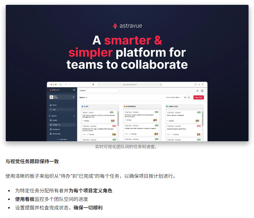 Astravue Technologies 是一款现代化的团队协作与项目管理平台,专为提高协作效率和任务可视化而设计。通过看板、日历、清单等多种视图,团队可以清晰地掌控项目进展。每个任务支持评论、标签、提醒和时间追踪,确保沟通集中、执行高效。