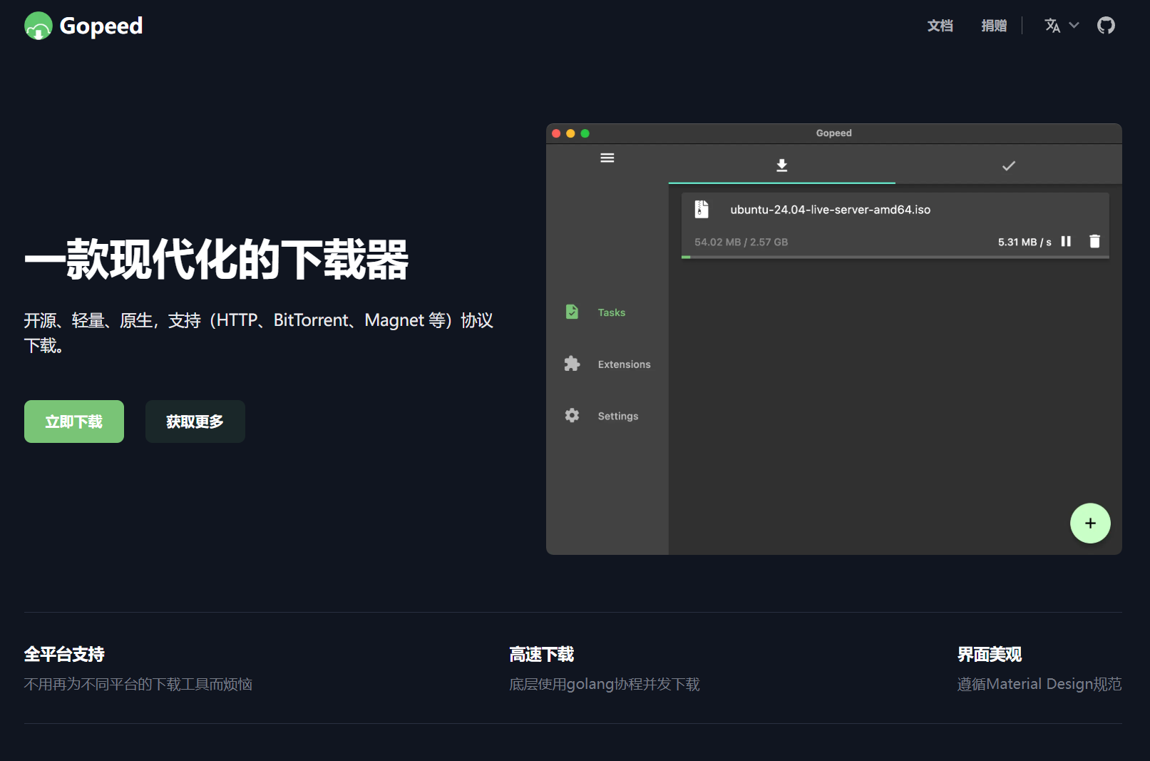 Gopeed 是一款跨平台的高速下载工具,基于 Go 开发,支持直链、磁力、BT 等多种下载协议,界面简洁,轻量高效,适合对下载速度和效率有要求的用户。