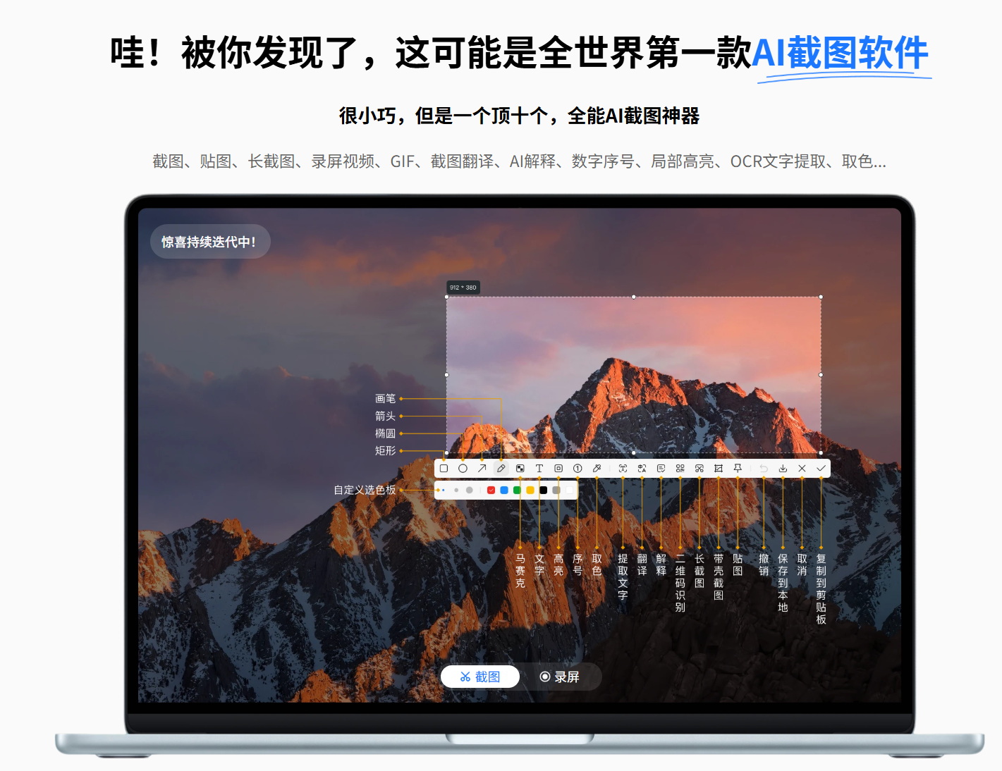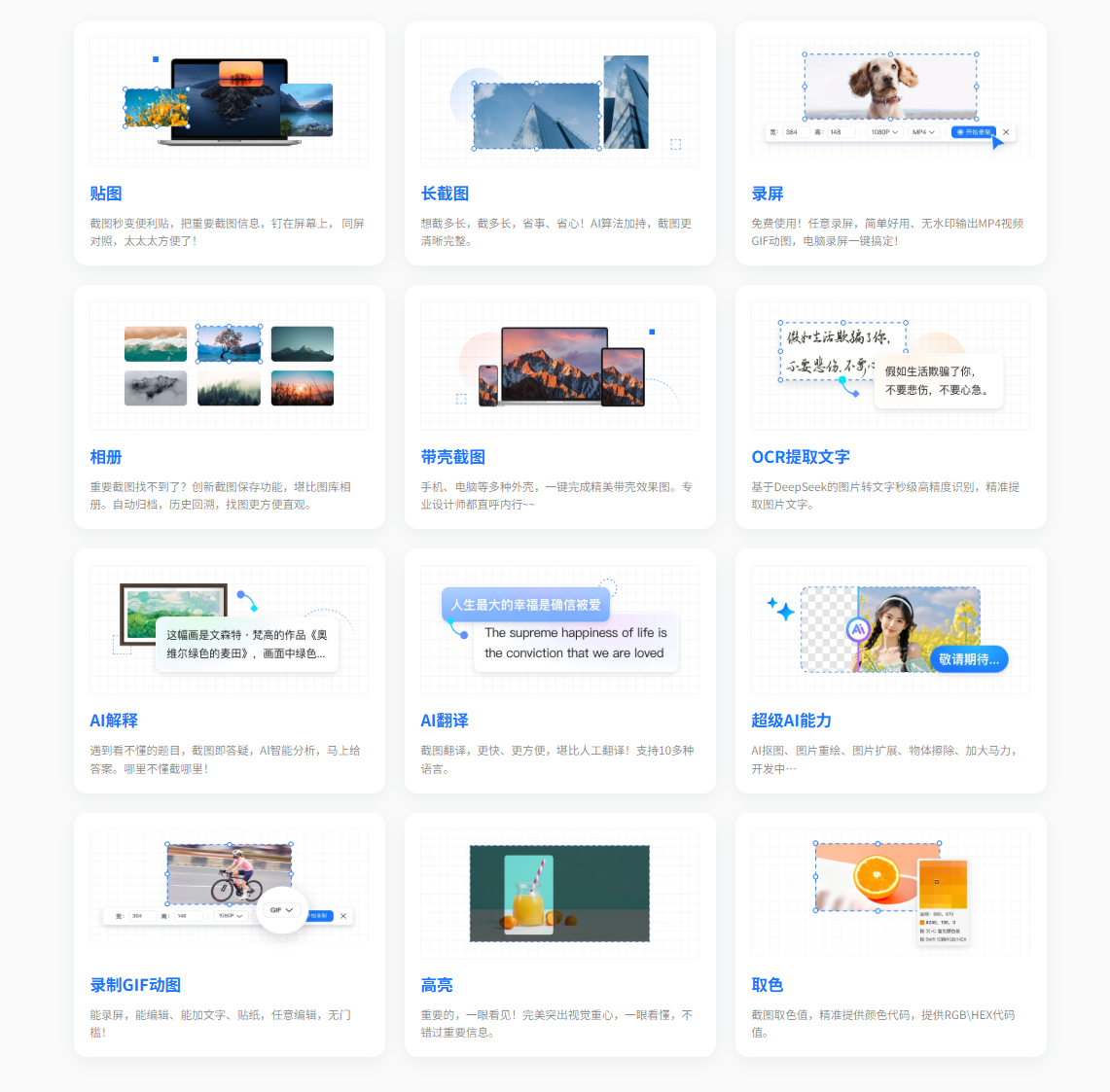 全功能覆盖:集截图、录屏、GIF 录制与 AI 识别于一体。