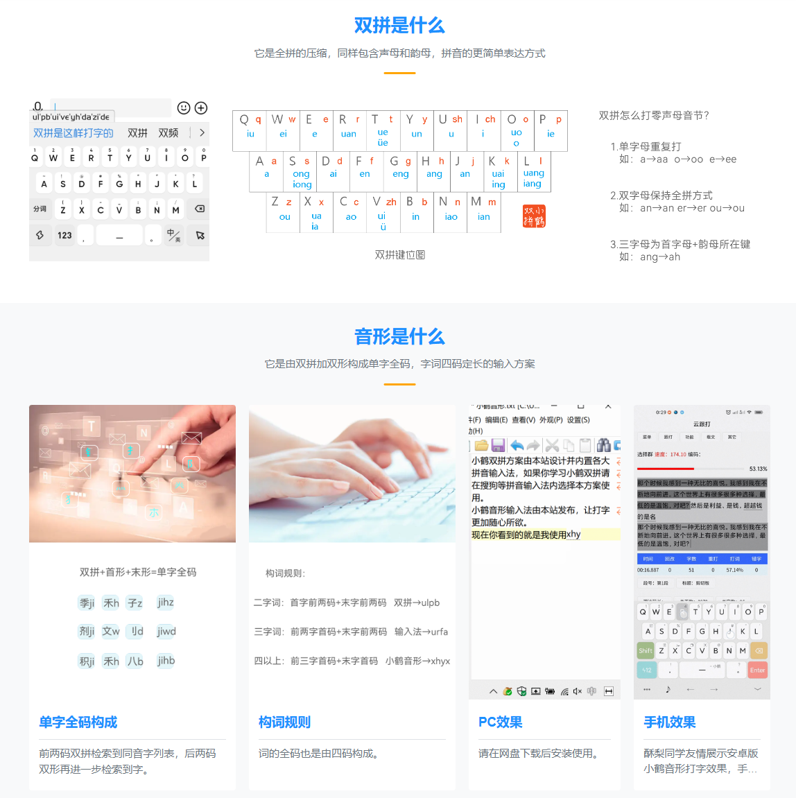 小鹤音形通过「前两码双拼 + 后两码形码」四码全码方式,实现单字快速出词(四码唯一即上屏)输入,显著减少选字操作,提高打字效率与精准性。